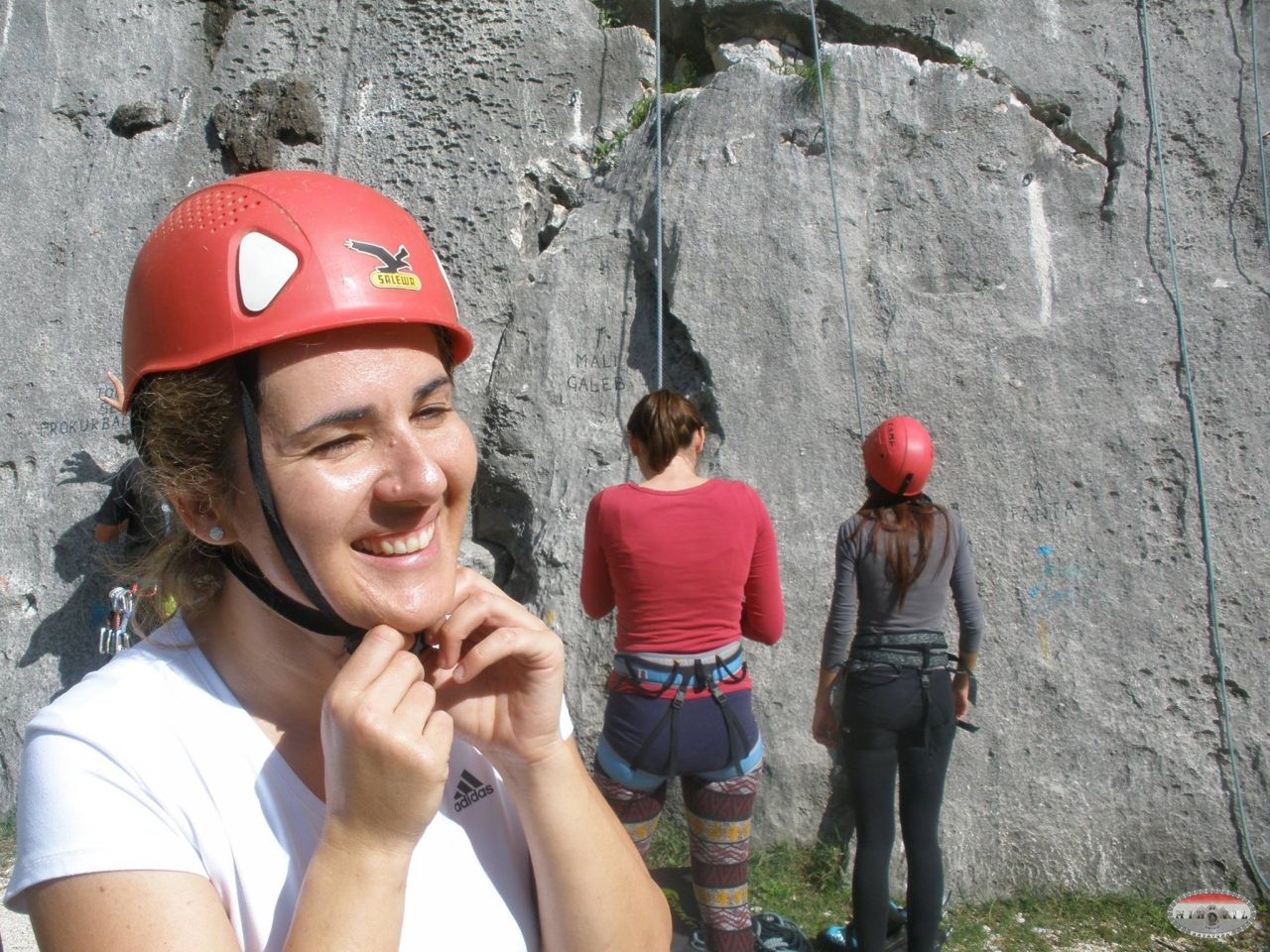 Odlučili smo virovat iskustvu našeg Dene i Goge (starih lisaca) i ne sumnjat. Dobro smo odlučili, šta će se ispostavit kasnije. Skupili se na dogovorenom mistru ispod štekata, kiša pljušti, kave se piju, marendaje ali polako ONA jenjava, evo nam sunca i lagano puše, gledamo stijene u daljini i vidimo suši seeeeeeeeee J.Krenuli prema Planovu, parkirali se , izvadili opremu, stijena se pomalo sušila, a mi asistenti smo dobili zadatak prezentirati školarcima pripreme prije penjanja, pobrojit spitove i postavit smjerove.