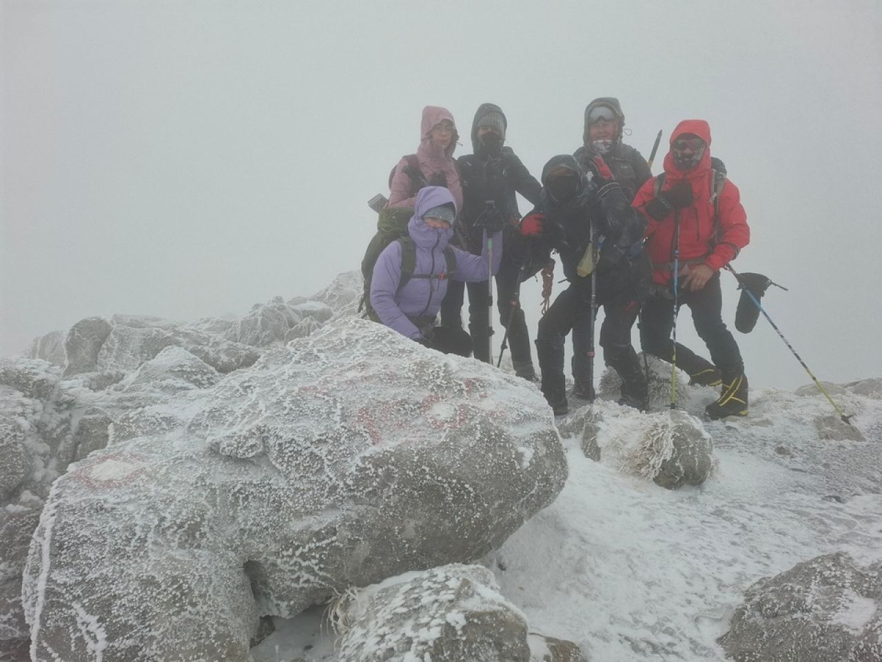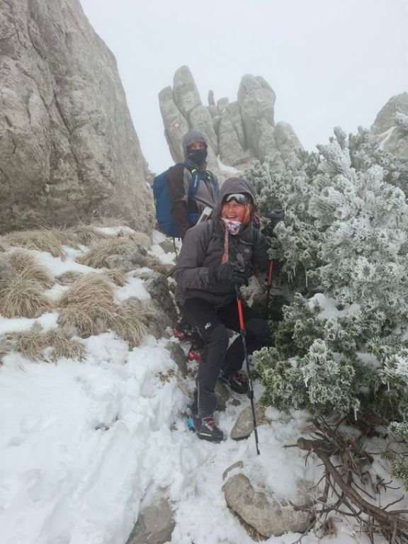 Po nepokrivenim dijelovima lica smo dobro osjetili sitne komadiće leda koji su nam se zabijali u kožu. Na nekim dijelovima staze vjetar nas je pošteno zanosio, sreća pa je bilo granja za hvatati se. Unatoč vremenskim neprilikama uspjeli smo se popeti do vrha, na brzinu smo se fotografirali i spustili nazad drugim putem. Prošli smo kraj još jednog zatvorenog doma, gdje smo u zaklonu s trojicom planinara iz Rijeke napravili pauzu od nekoliko minuta.