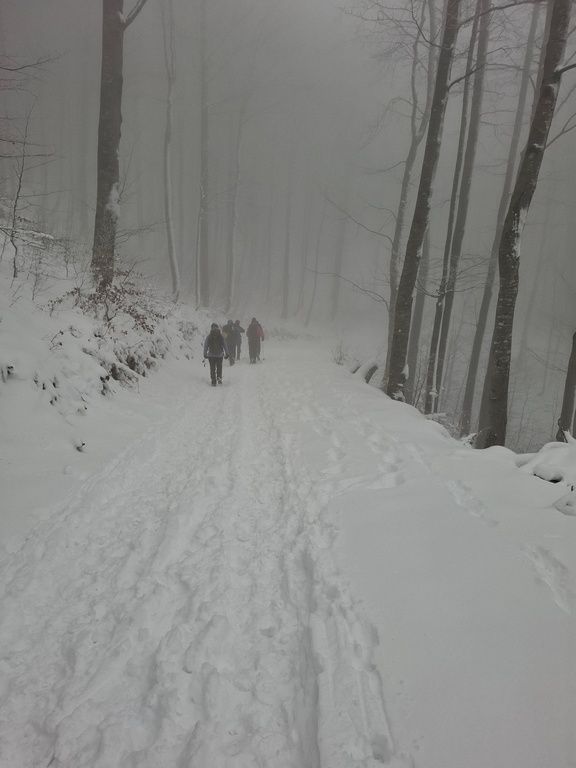 Vremenska prognoza je bila nešto nepovoljnija nego za subotu, po dolasku na parkiralište nas je dočekala gusta magla. Krenuli smo polako, sa skijališta kroz šumu. Što je šuma bila rjeđa, vjetar je pojačavao i šibao nas po obrazima. Prsti su se ledili i kroz duple rukavice. Na sebe smo tada navukli sve što smo imali. Naravno da nisam stigla jesti i da mi je ovo bila zadnja prilika da se okrijepim napola zaleđenom palačinkom i energetskom pločicom.