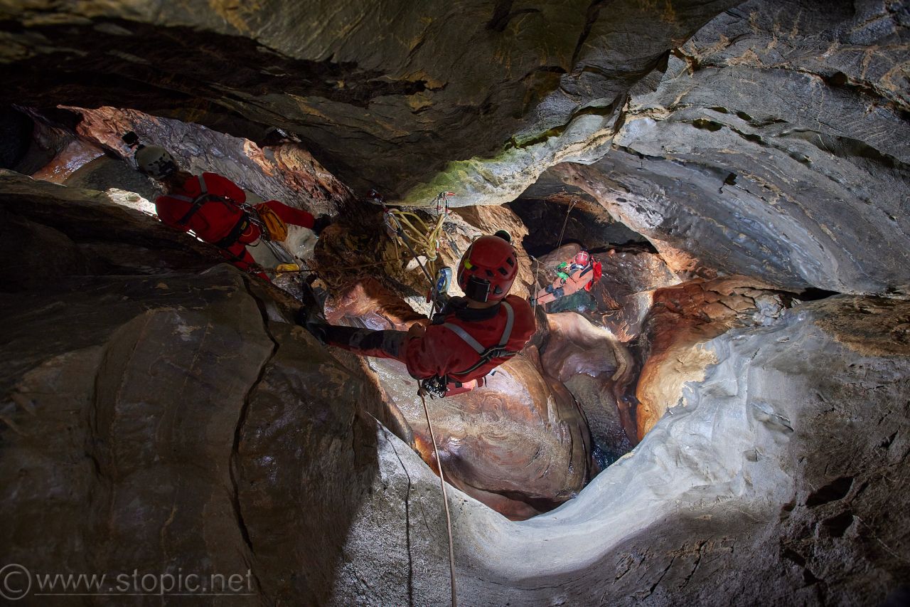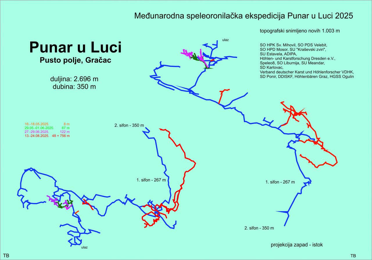 U danima koji su slijedili je nastavljeno s transportom ronilačke opreme do prvog sifona. Kad je sve kompletirano u sifon su ušli prvi ronioci koji su preronili prvi sifon, ali su ustvrdili da se u sifonu nalazi restrikcija koja je u kombinaciji sa nultom vidljivosti prevelik rizik po život u uvjetima višekratnog prolaženja i teškog fizičkog napora koji se očekuje u radu iza sifona. Time se odstalo od glavnog cilja ekspedicije ali se nastavilo sa tehničkim penjanjem dimnjaka u dijelu ponora između ulaza i bivka. Na vrhu jednog se pronašla mreža kosih, suhih kanala s tragovima povremene hidrološke aktivnosti. Tako je usporedno s transportom i vraćanjem ronilačke opreme kartirano novih 756 m kanala koji prati glavni kanal na manjoj dubini. Krajnja dosegnuta točka se nalazi svega 20m tlocrtno istočno i 90 m iznad ulaza u drugi sifon na 350 m dubine koji je bio glavni cilj ekspedicije, uz mogućnost daljeg napredovanja prema dolje spuštanjem. Kako se bližio kraj ekspedicije speleološko istraživanje je tu prekinuto te započeto sa raspremanjem objekta s time da je ostavljen opremljen penj – ulaz u nove kanale.